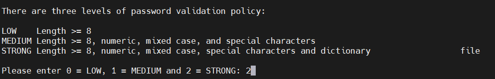 输入2代表密码最小长度必须大于等于8个字符并且是数字,字母,特殊字符混合的,密码不能包含在弱密码字典中