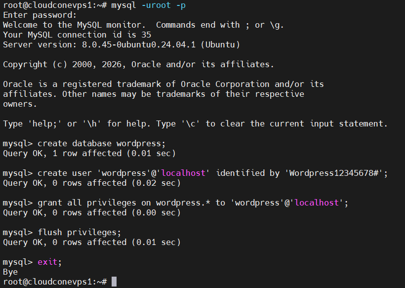 1 | create user 'wordpress'@'localhost' identified by '<your_strong_password>'; |
