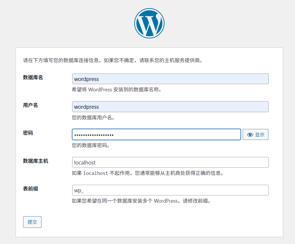 填写数据库名,数据库用户名和密码,点击提交