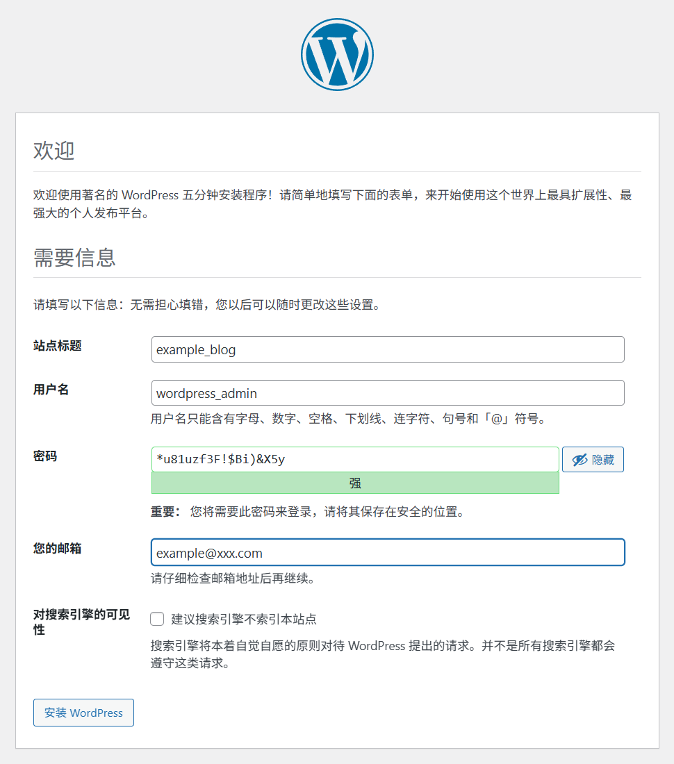 填写信息并点击安装wordpress