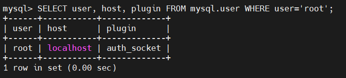 1 | SELECT user, host, plugin FROM mysql.user WHERE user='root'; |